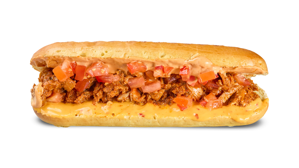 Hot Dog Bun mit Pulled Tinga Chicken, Chipotle Sauce, Cheese Sauce. Wahlweise mit Jalapeños.