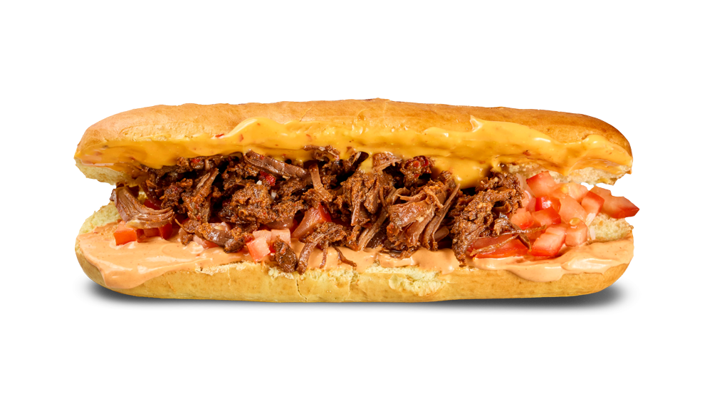 Hot Dog Bun mit Pulled Beef, Chipotle Sauce, Cheese Sauce. Wahlweise mit Jalapeños.