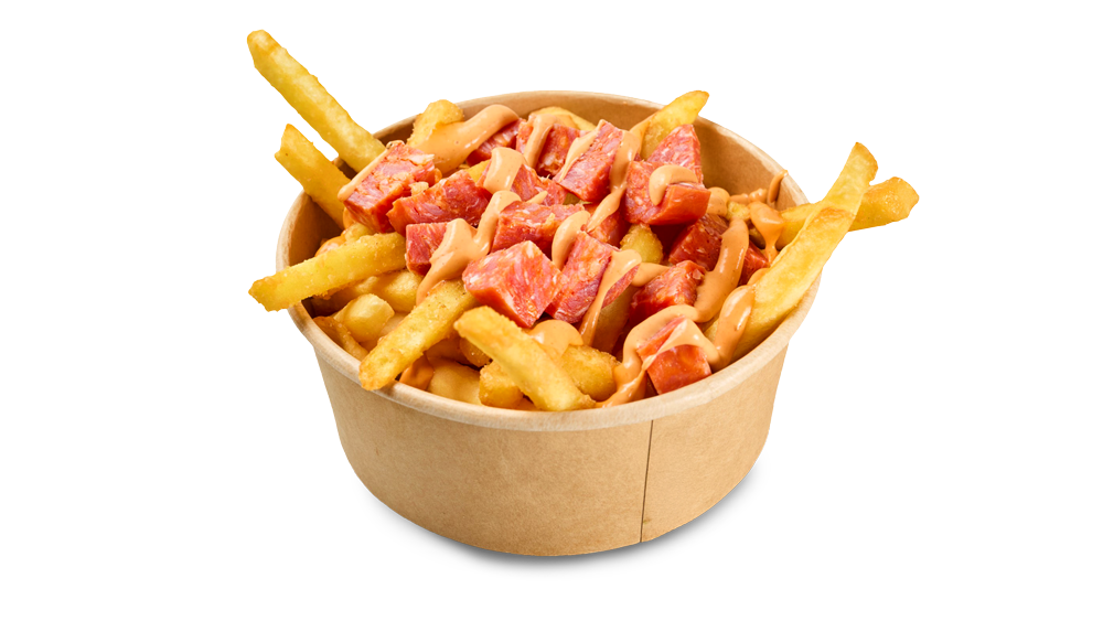 Pommes mit Guacamole, Tomaten und Chipotle Sauce. Enthält Knoblauch, Petersilie.
