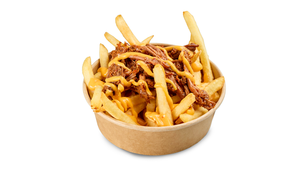Pommes mit Pulled Beef und Chili Cheese Sauce.